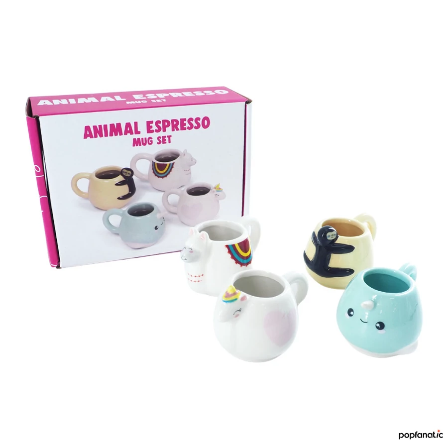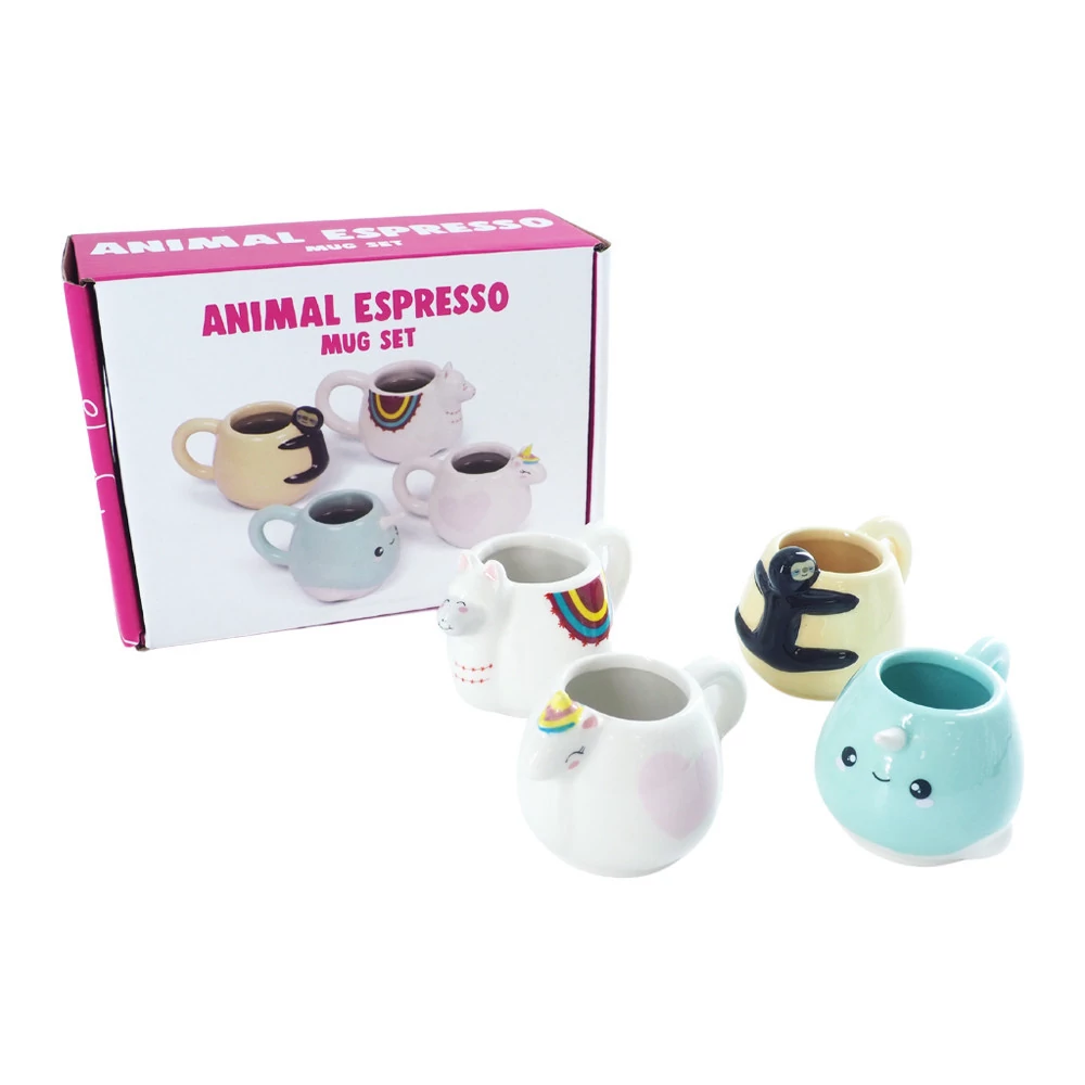 A Thumbs up Állati espresso szett négy vidám, kerámia eszpresszócsészét tartalmaz: narvál, egyszarvú, láma és lajhár formákkal. Minden csésze 30 ml-es, kézzel mosható, nem használható mikrohullámú sütőben vagy mosogatógépben.
